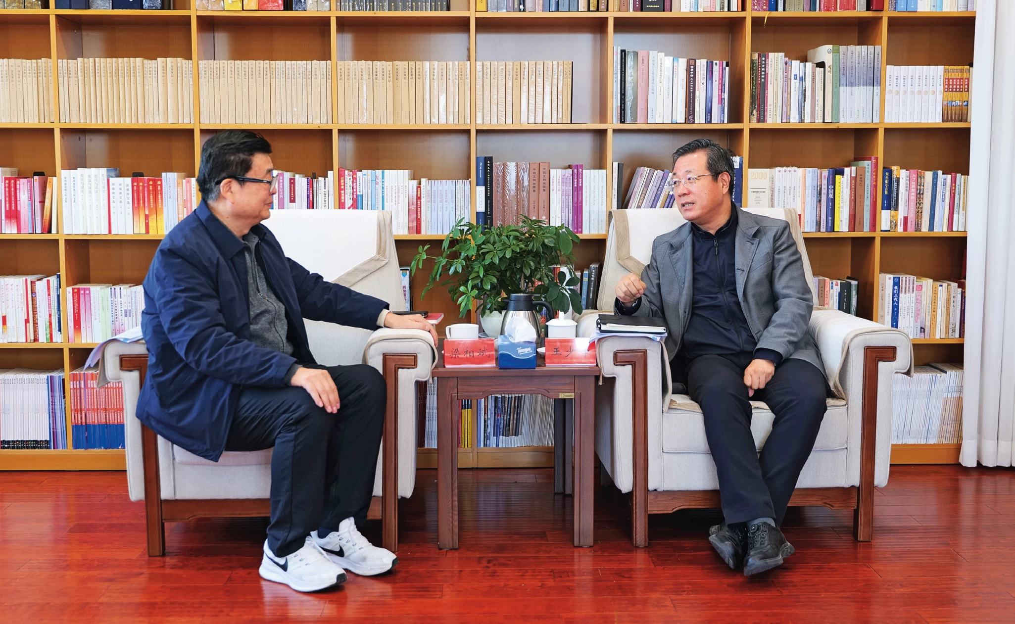 2025年10月22日,王少峰(右)接受《人民法治》杂志社社长兼总编辑梁相斌专访(徐峰 摄)