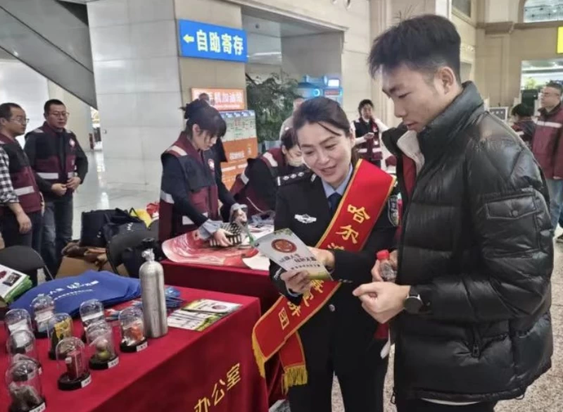 在哈尔滨火车站的宣传点,“龙江好人帮”的志愿者们早已忙开了:有的捧着仿真毒品模型,配合民警向旅客细致拆解“伪装术”,从看似普通的“糖果”到包装精致的“奶茶粉”,一一指出新型合成毒品的隐蔽特征;有的手持识别图册,蹲下身给随行的孩子讲解“为什么不能随便要陌生人的东西”。