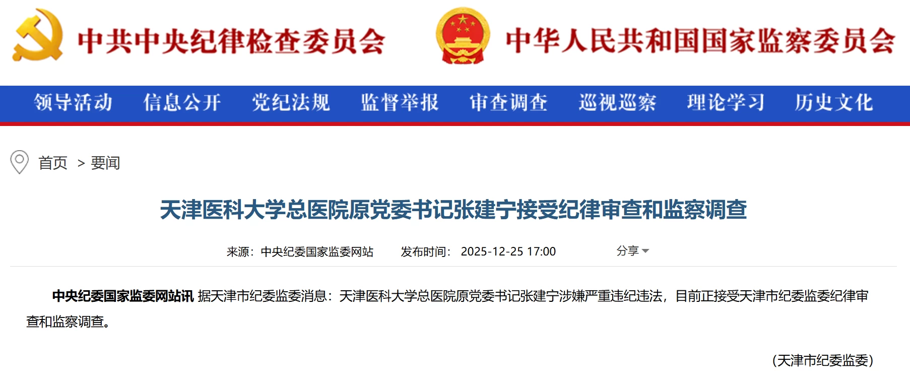 天津医科大学总医院原党委书记张建宁接受纪律审查和监察调查 2025-12-26 11:26 许文钰 据天津市纪委监委消息:天津医科大学总医院原党委书记张建宁涉嫌严重违纪违法,目前正接受天津市纪委监委纪律审查和监察调查。