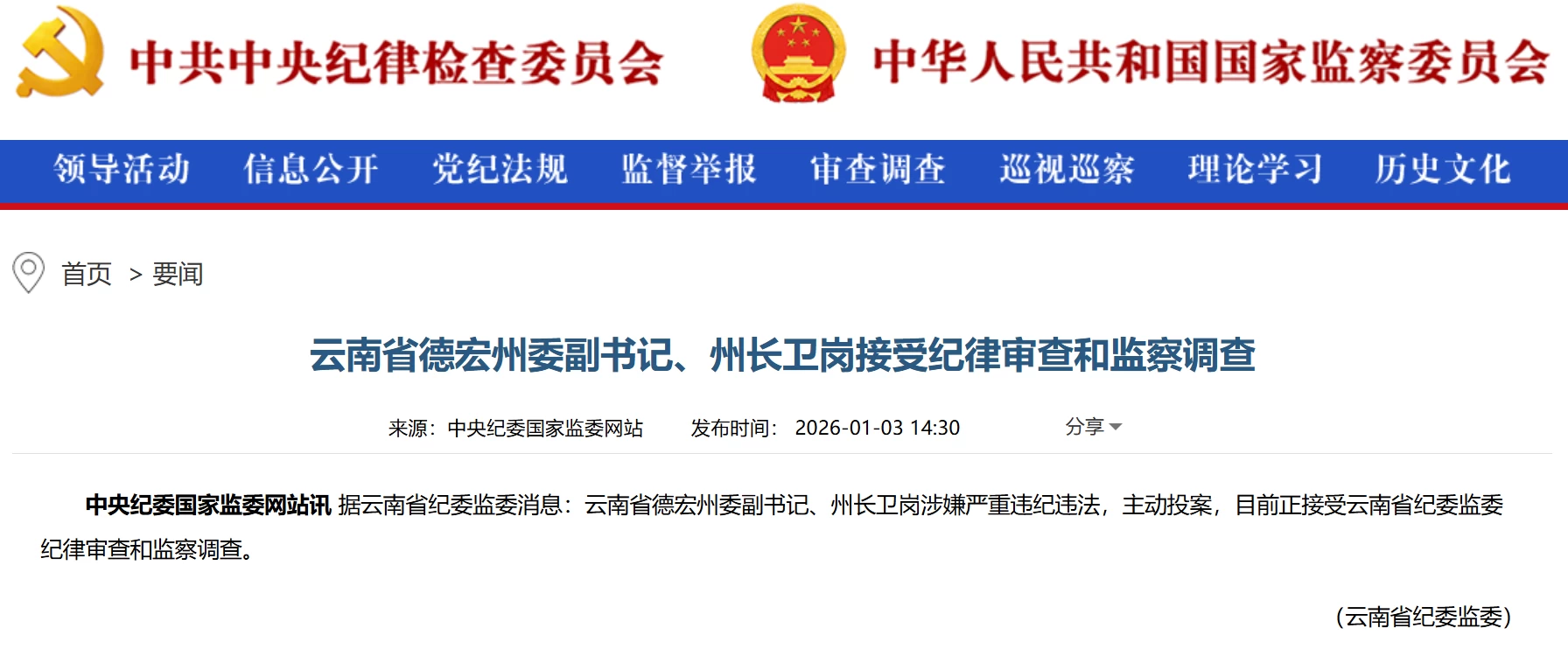 云南省德宏州委副书记、州长卫岗接受纪律审查和监察调查 2026-01-04 08:57 许文钰 据云南省纪委监委消息:云南省德宏州委副书记、州长卫岗涉嫌严重违纪违法,主动投案,目前正接受云南省纪委监委纪律审查和监察调查。