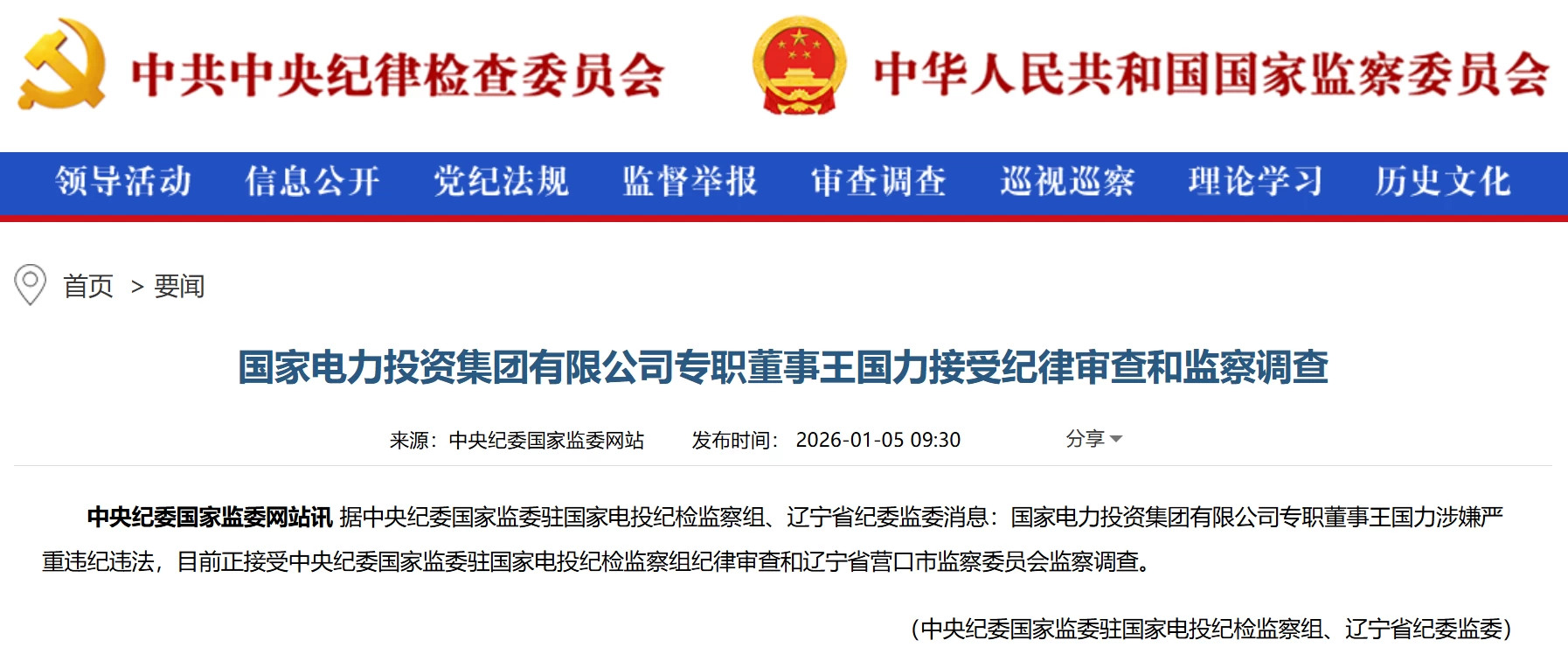 国家电力投资集团有限公司专职董事王国力接受纪律审查和监察调查 2026-01-05 10:46 许文钰 据中央纪委国家监委驻国家电投纪检监察组、辽宁省纪委监委消息:国家电力投资集团有限公司专职董事王国力涉嫌严重违纪违法,目前正接受中央纪委国家监委驻国家电投纪检监察组纪律审查和辽宁省营口市监察委员会监察调查。