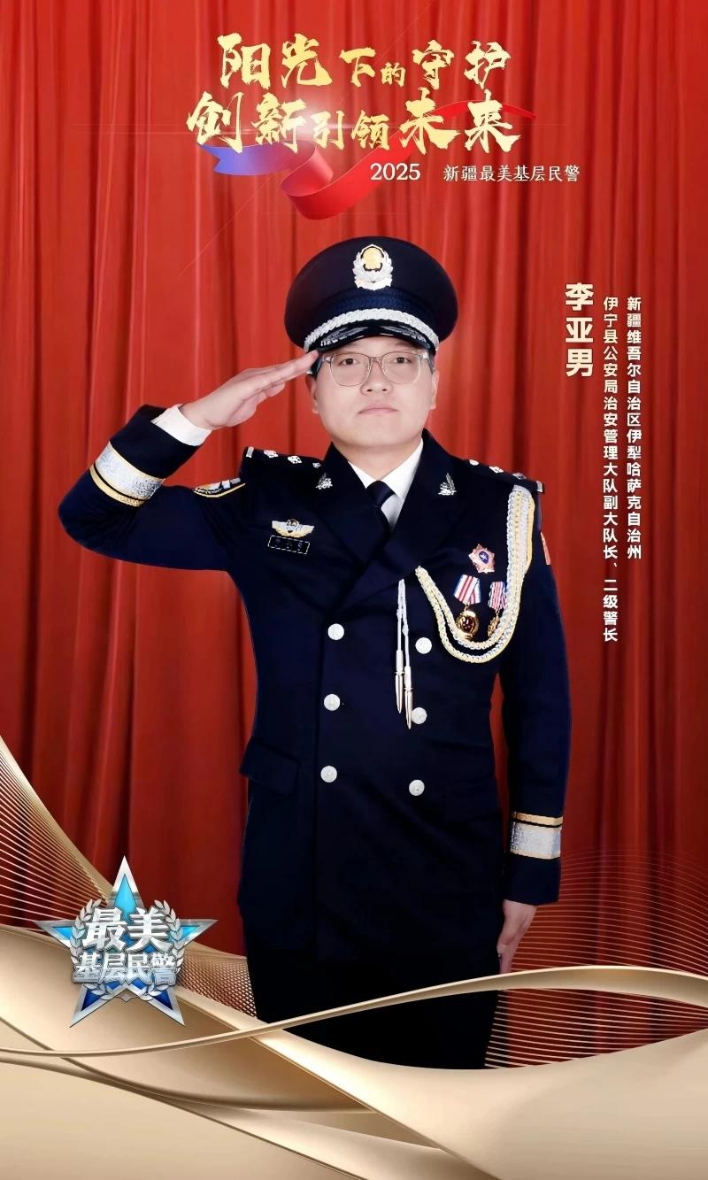 在新疆伊犁哈萨克自治州伊宁县的青山绿水间,有这样一位民警,他用十年光阴践行“人民公安为人民”誓言,从青涩新警成长为治安管理大队副大队长,用脚步丈量平安,用行动温暖民心。他就是伊宁县公安局治安管理大队副大队长李亚男,曾获全疆公安机关缉枪治爆成绩突出个人称号,荣立个人二等功1次、三等功1次。被新疆维吾尔自治区党委宣传部、新疆维吾尔自治区公安厅联合授予2025新疆“最美基层民警”。