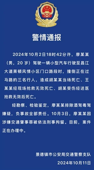 明日上午,景德镇一家三口被撞身亡案将在景德镇市中级人民法院公开宣判。该案距2024年10月2日事发已逾460天,距2025年4月15日一审开庭也超过260天。