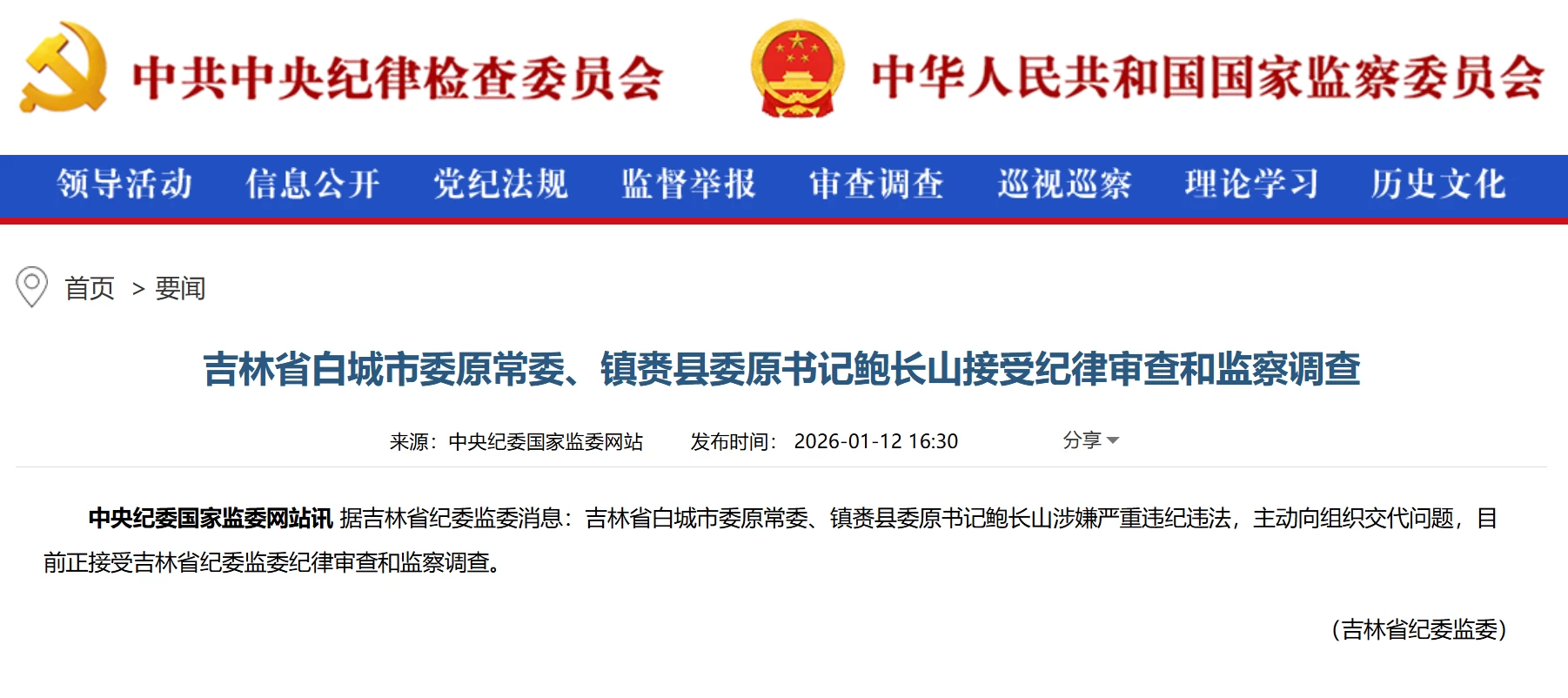 吉林省白城市委原常委、镇赉县委原书记鲍长山接受纪律审查和监察调查 2026-01-12 16:45 许文钰 据吉林省纪委监委消息:吉林省白城市委原常委、镇赉县委原书记鲍长山涉嫌严重违纪违法,主动向组织交代问题,目前正接受吉林省纪委监委纪律审查和监察调查。