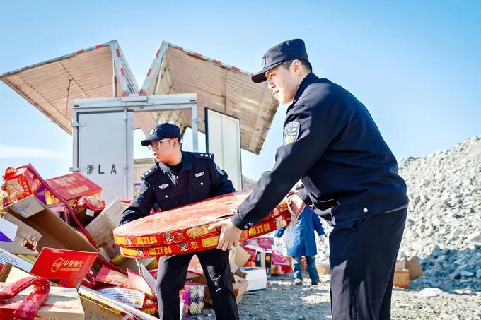 集中销毁 2026-01-14 11:07 桂胜博 1月12日,浙江省舟山市公安局定海区分局治安大队开展违规存放烟花爆竹集中销毁行动,及时消除安全隐患,严防发生意外燃爆,保障辖区群众生命财产安全。图为民警辅警堆放违规烟花爆竹,准备进行集中销毁。王涛 摄