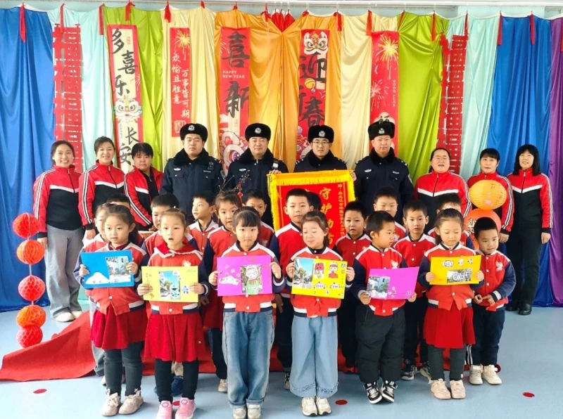幼儿园的小朋友们精心准备了锦旗与手绘奖状。一张张笔触稚嫩的奖状,承载着孩子们对平安守护者的真挚谢意;一面面鲜艳的锦旗,凝聚着警民同心的深厚情谊。孩子们排着整齐的队伍,郑重地将礼物送到民警手中,民警们敬礼致谢,纯真的笑脸与藏蓝的身影相映成景,现场掌声阵阵。