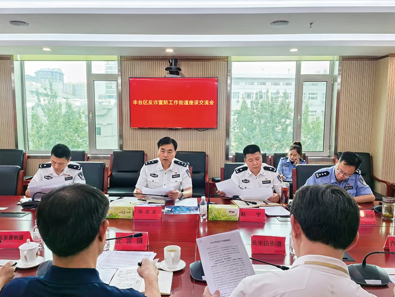 2025年6月19日,北京市丰台区公安分局局长陈龙波(正面左二)、副局长赵宁(正面左三)组织部分街镇召开丰台区反诈宣防工作街镇座谈交流会(海星宇 摄)