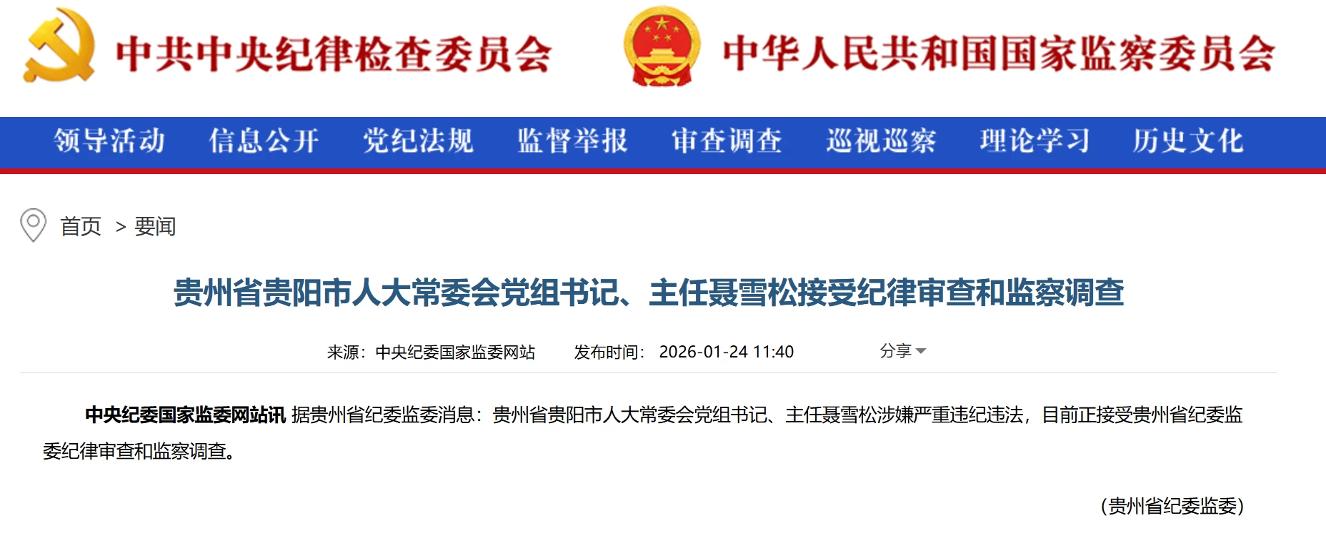 贵州省贵阳市人大常委会党组书记、主任聂雪松接受纪律审查和监察调查 2026-01-24 13:52 许文钰 据贵州省纪委监委消息:贵州省贵阳市人大常委会党组书记、主任聂雪松涉嫌严重违纪违法,目前正接受贵州省纪委监委纪律审查和监察调查。
