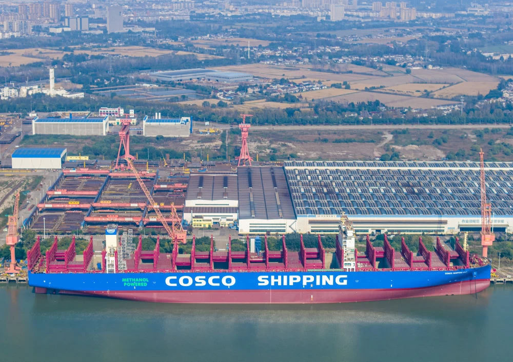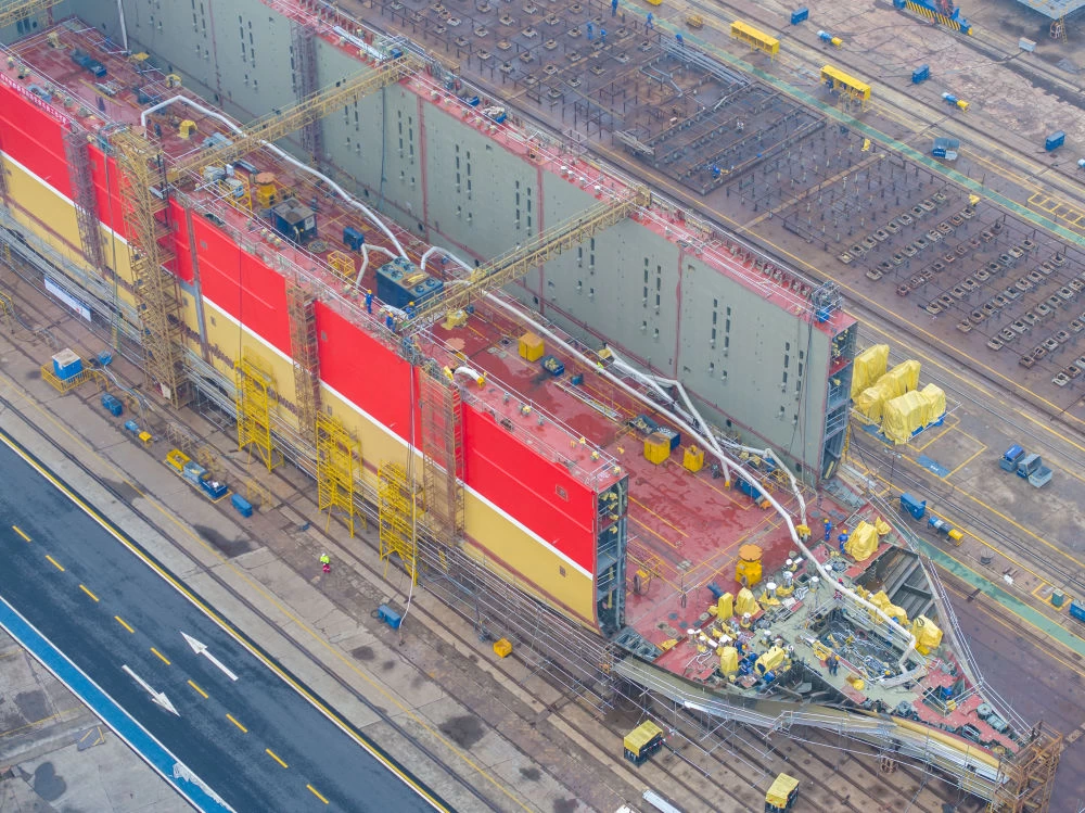 ↑ 2025年11月13日拍摄的江苏省扬州市江都区的扬州中远海运重工有限公司生产厂区,工人们抓紧建设大型船舶(无人机照片)。新华社发(任飞 摄)