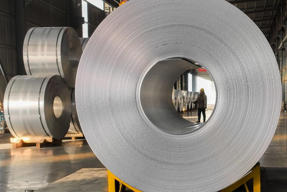 ↑ 1月20日,在山东省邹平市青阳镇盛广新材料有限公司,工人在吊装生产的铝卷。新华社发(董乃德 摄)
