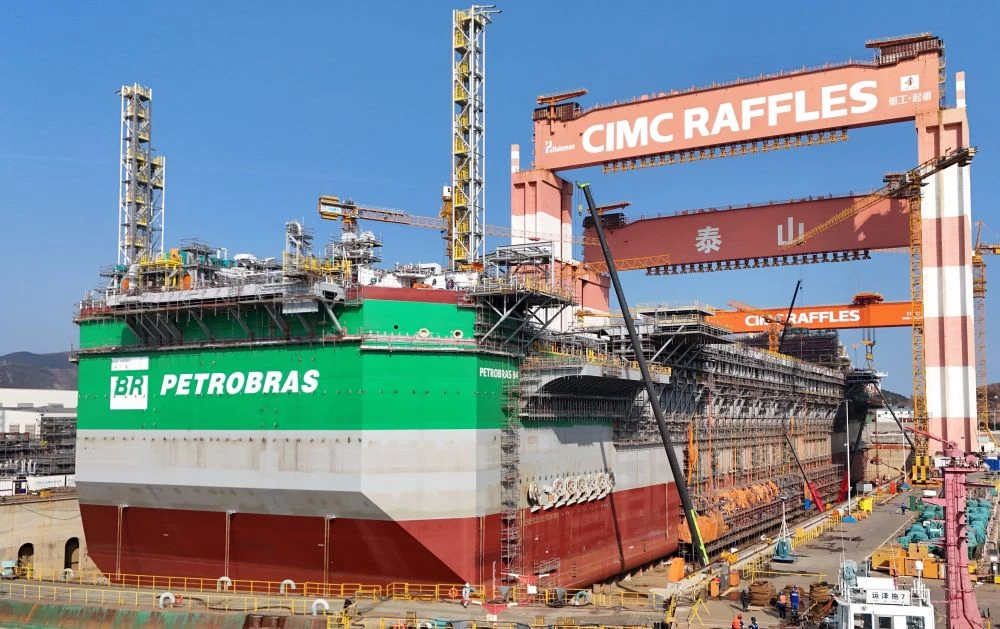 ↑ 1月27日,在中集来福士山东烟台建造基地,一艘浮式生产储卸油船在进行建造作业(无人机照片)。新华社发(唐克 摄)