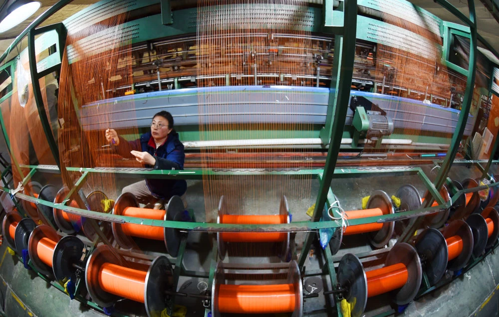 ↑ 1月27日,江苏连云港高新区海州工业园一家企业生产车间,工人赶制一批订单网具。新华社发(耿玉和 摄)