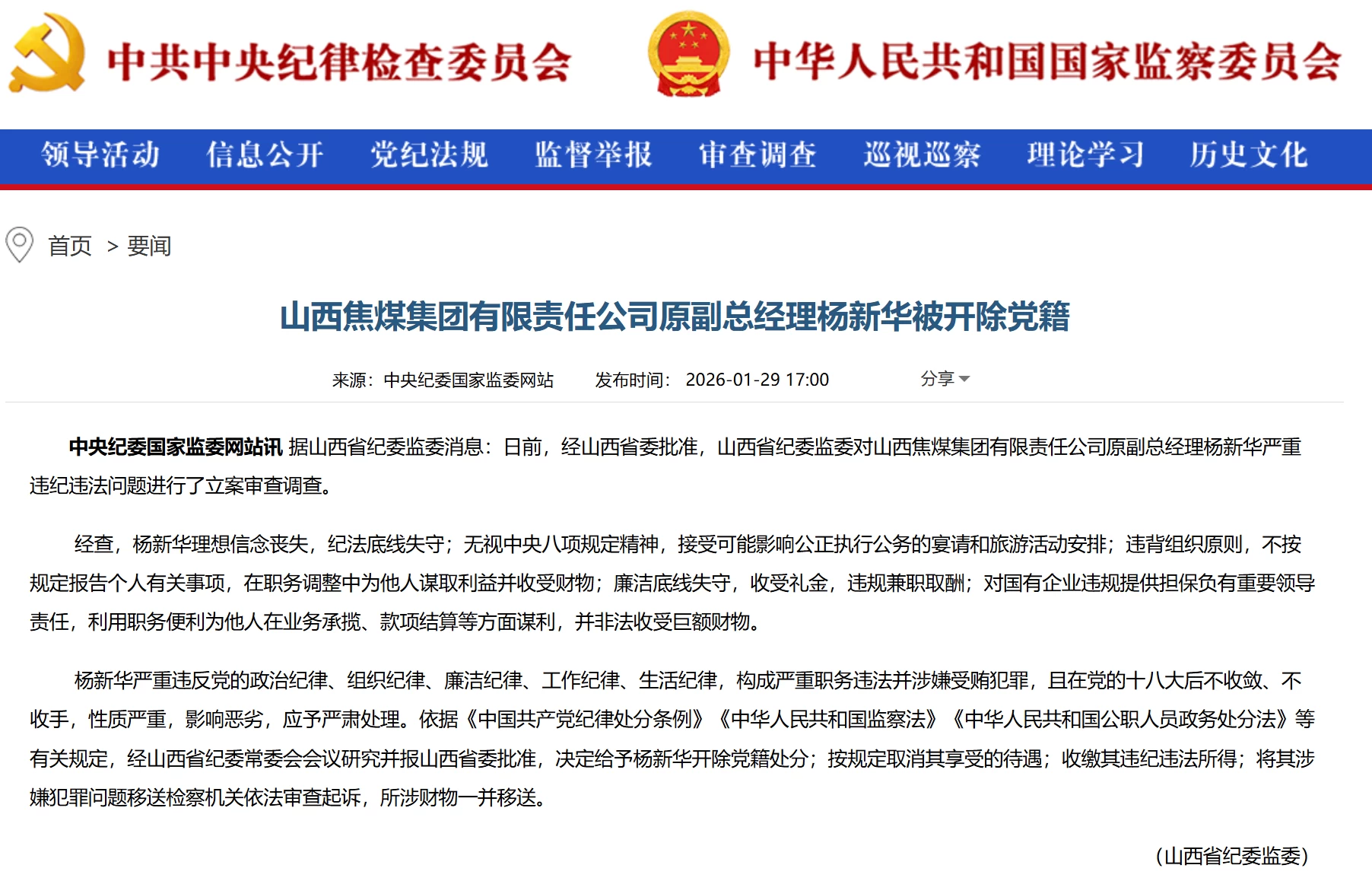 据山西省纪委监委消息:日前,经山西省委批准,山西省纪委监委对山西焦煤集团有限责任公司原副总经理杨新华严重违纪违法问题进行了立案审查调查。