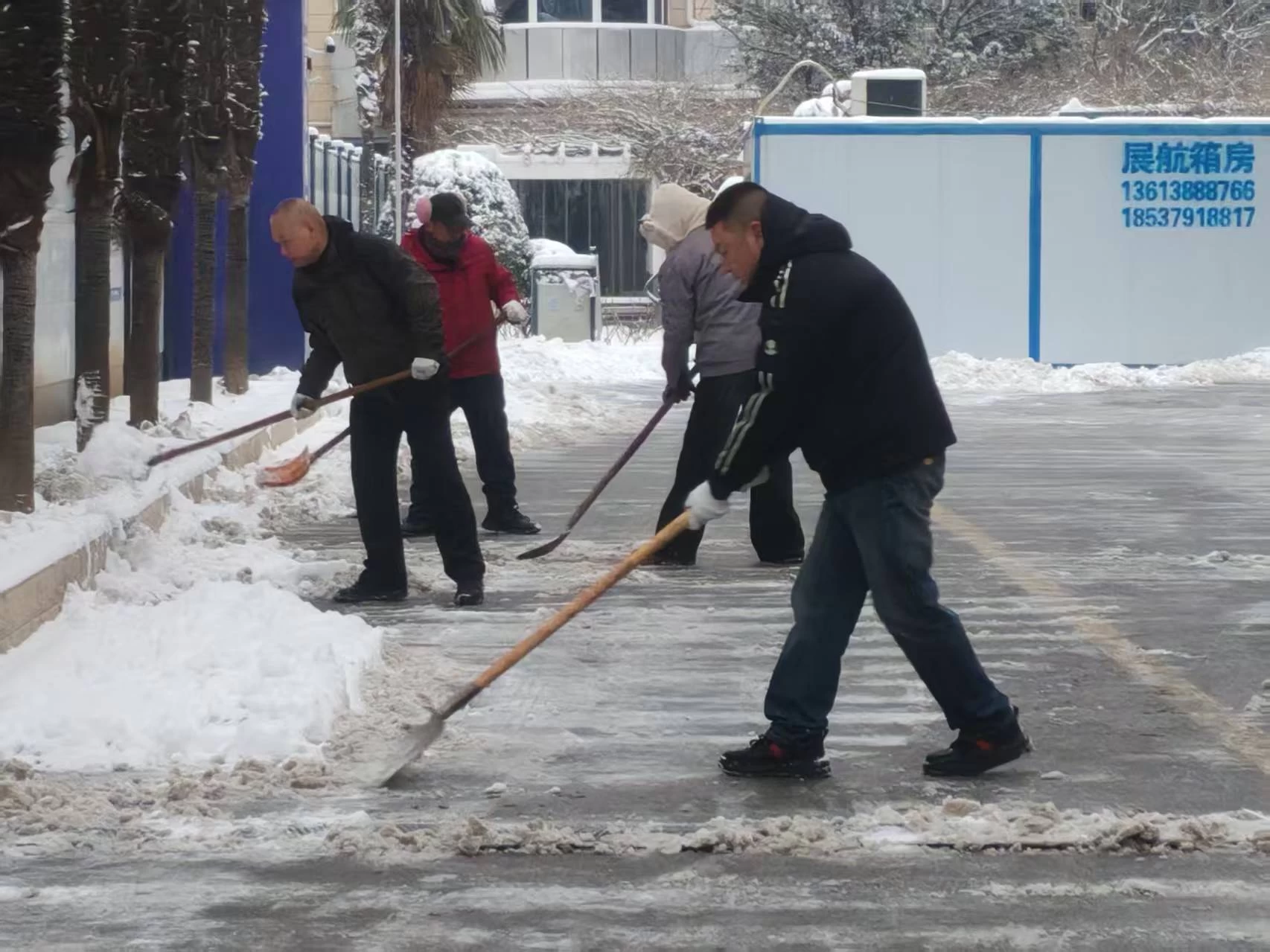 物资与队伍保障方面,提前储备融雪剂200余公斤、除雪铲20余把、防滑链4套、防滑草苫60余块,组建15人应急除雪队伍,明确“雪停即清、雪后即净”作业标准。降雪时,队伍分工协作,以“人工清扫+融雪剂辅助”优先清理关键区域冰雪,在易滑区域铺设防滑垫、设置警示标识。截至目前,累计除雪2次,清理路面1200余平方米,铺设防滑垫40余处,未发生冰雪致安全事故。