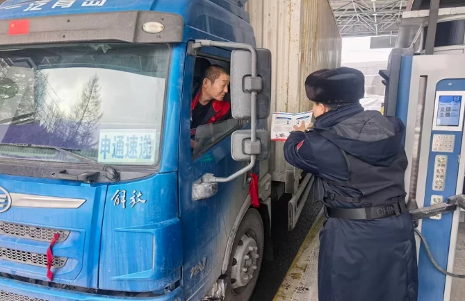 长白县长白镇边境检查站民警在卡点为过往货运司机精准普法