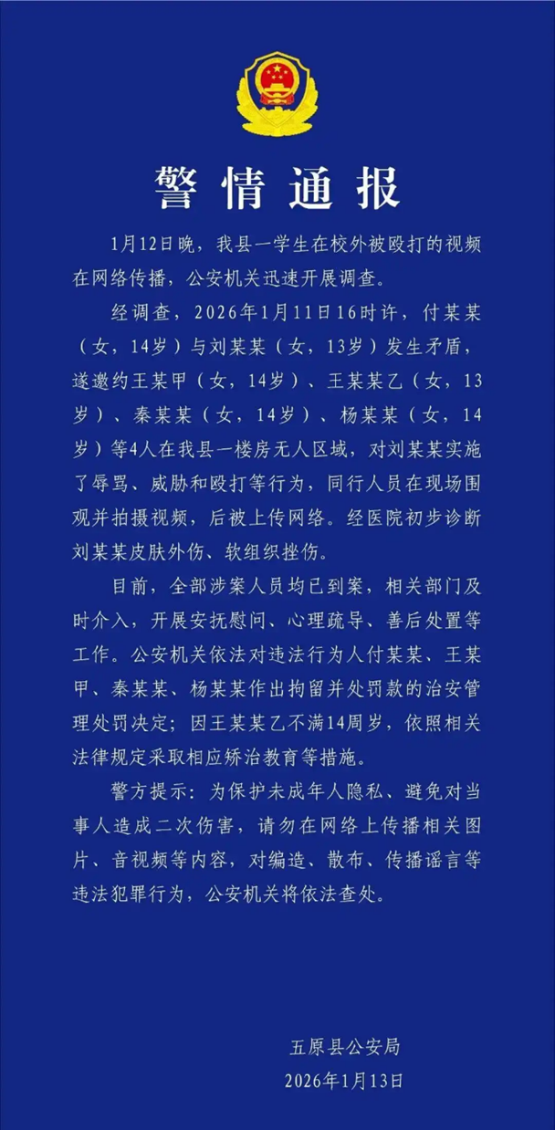 内蒙古巴彦淖尔市五原县也查处了一起未成年人殴打同学的案件,4名14岁女生因纠纷殴打同学被依法拘留。1月11日,14岁的付某某(女)因与13岁的刘某某(女)发生矛盾,邀约3名同龄女生和一名13岁女生,在当地一楼房无人区域对刘某某实施辱骂、威胁和殴打,相关视频被上传网络引发关注。经医院诊断,刘某某为皮肤外伤、软组织挫伤。公安机关依法对付某某等4名14岁女生作出拘留并处罚款的治安管理处罚决定,未满14岁的涉案人员则被采取相应矫治教育等措施,相关部门同步开展安抚慰问、心理疏导等工作。