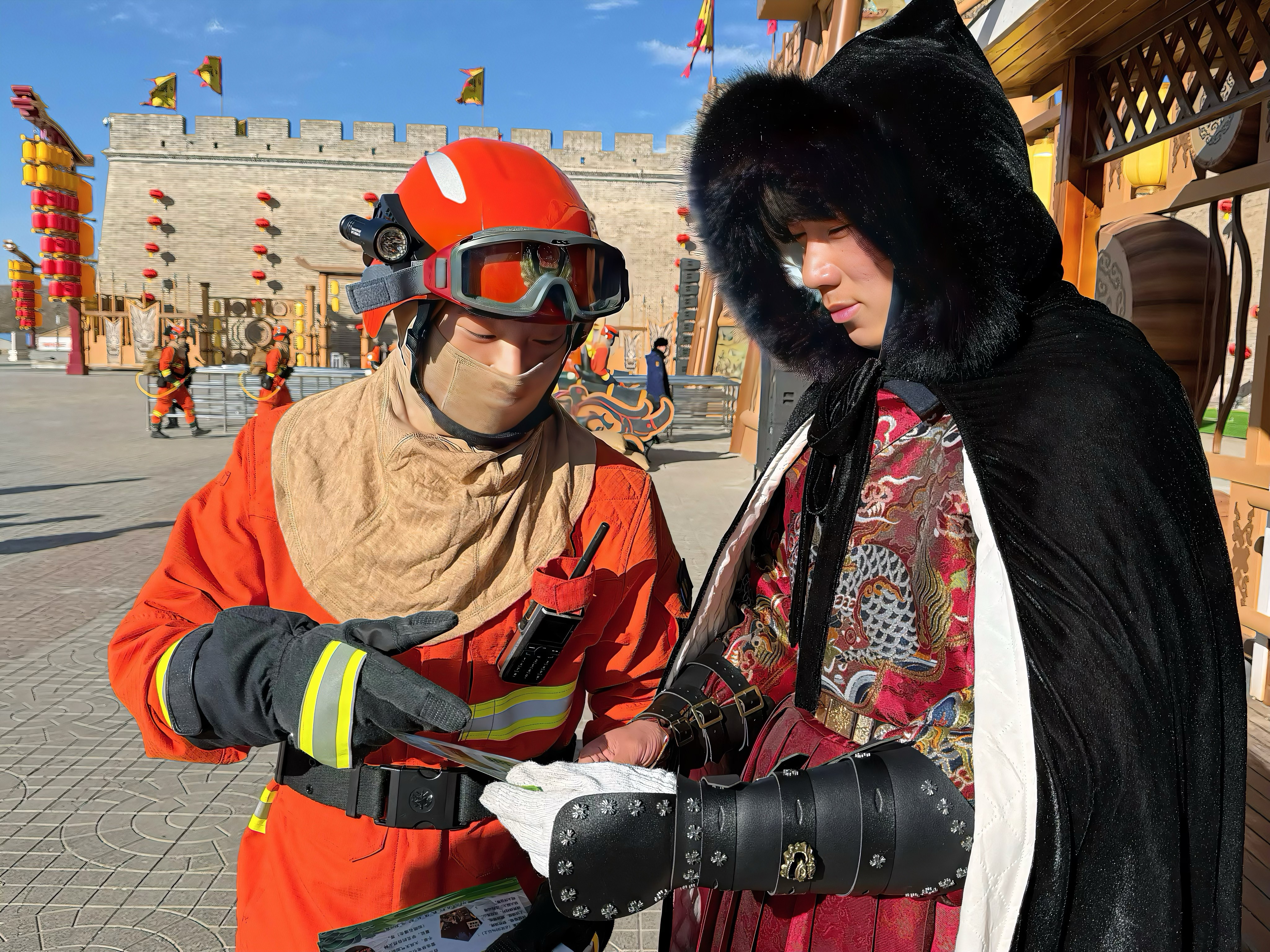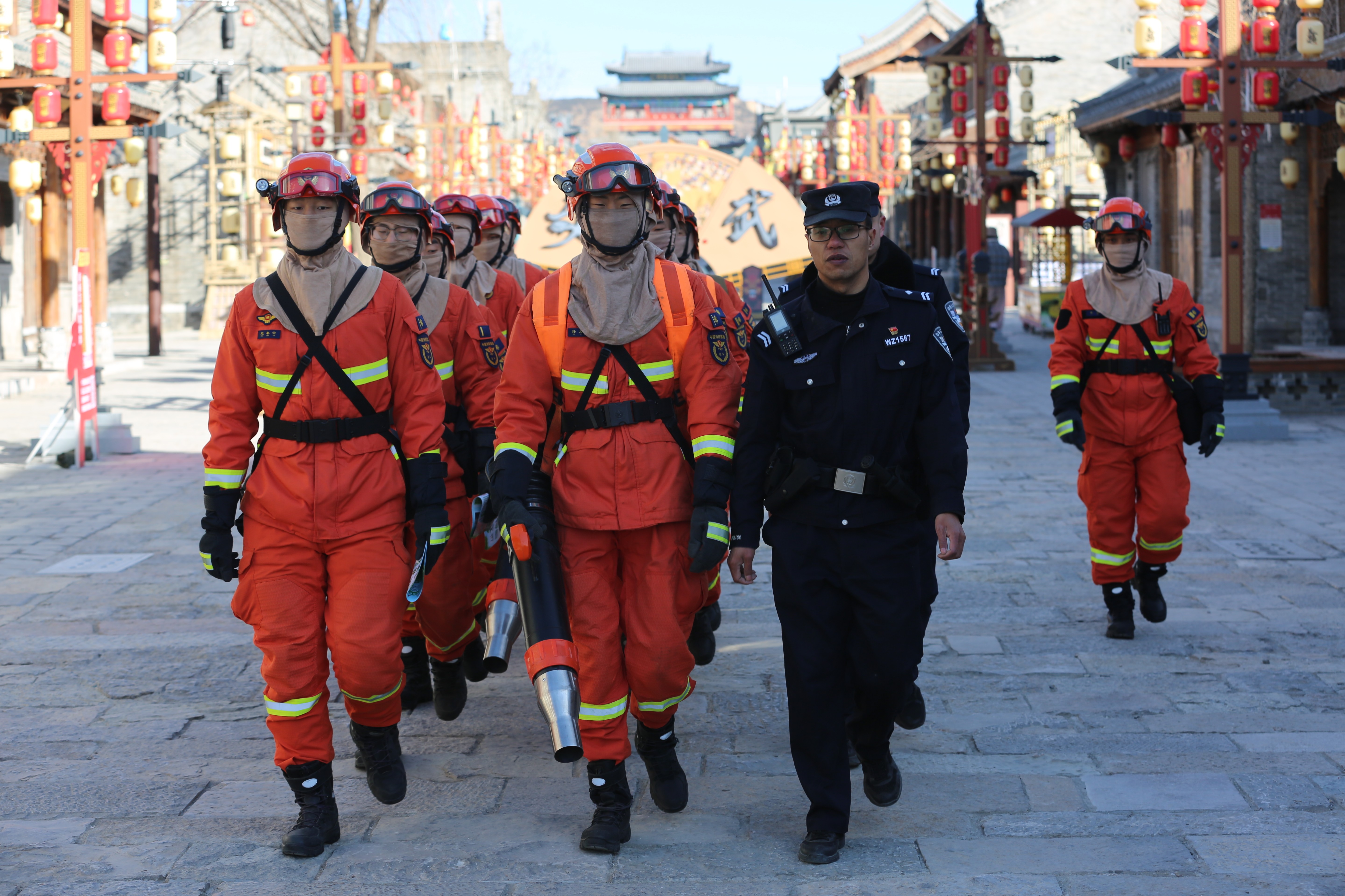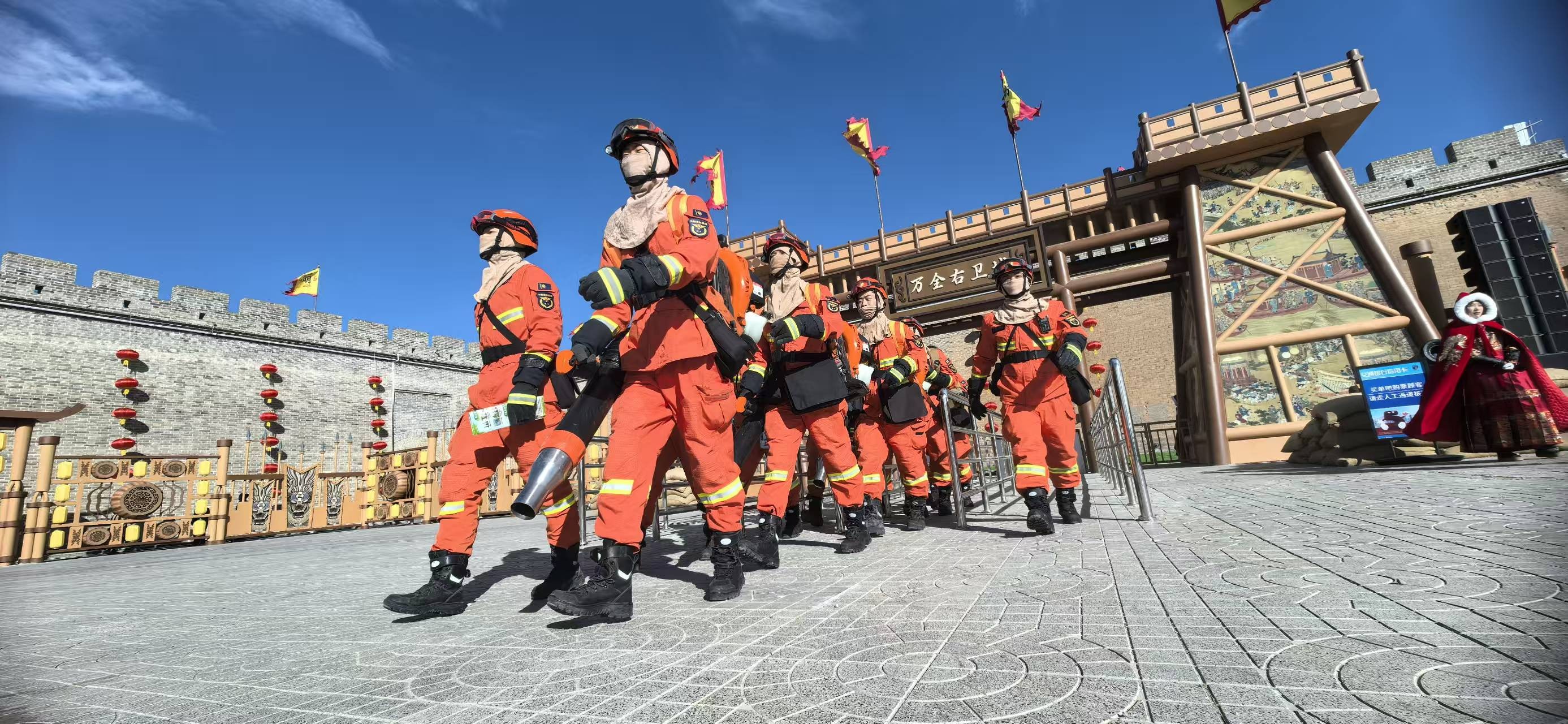 中午时分,游客渐渐多起来。迎恩门广场上,民俗展演正热闹,人群里忽然多了一抹“火焰蓝”——执勤分队的指战员们开始做防火宣传了。他们弯着腰给孩子们讲灭火器的用法,让小家伙们摸摸消防服的质感。有游客主动上前合影,镜头里,青砖灰瓦的背景前,那一抹蓝色格外醒目。他们借着春节人流密集,把“古城防火,人人有责”讲成游客听得进、记得住的话。