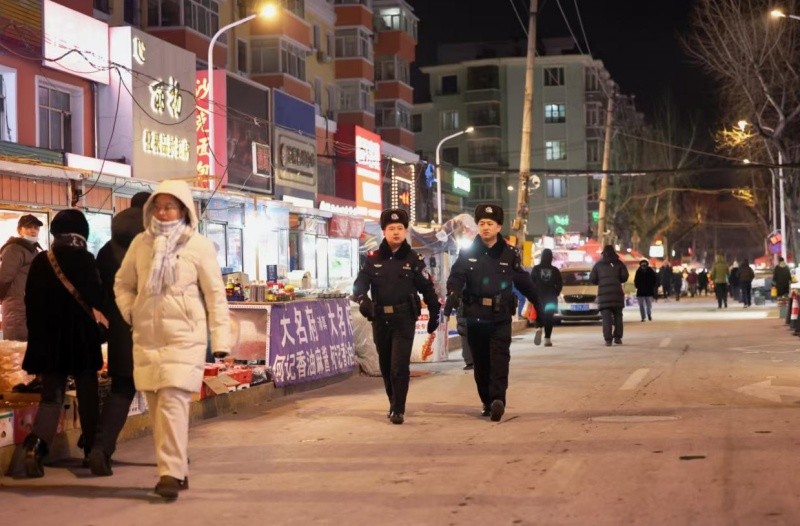 除夕夜,华灯初上,东莱派出所巡逻警力准时抵达网红街——草市街。此时,夜市灯火璀璨,游客络绎不绝,热闹非凡。寒夜挡不住坚守的脚步,民警穿梭在熙熙攘攘的人群中,密切关注着周边治安动态,提醒市民游客保管好随身物品,随时准备为群众提供帮助。东莱民警还化身“导游”,热情解答着游客关于特色美食以及周边景点的问询,让游客在冰城玩得开心、玩得安心。