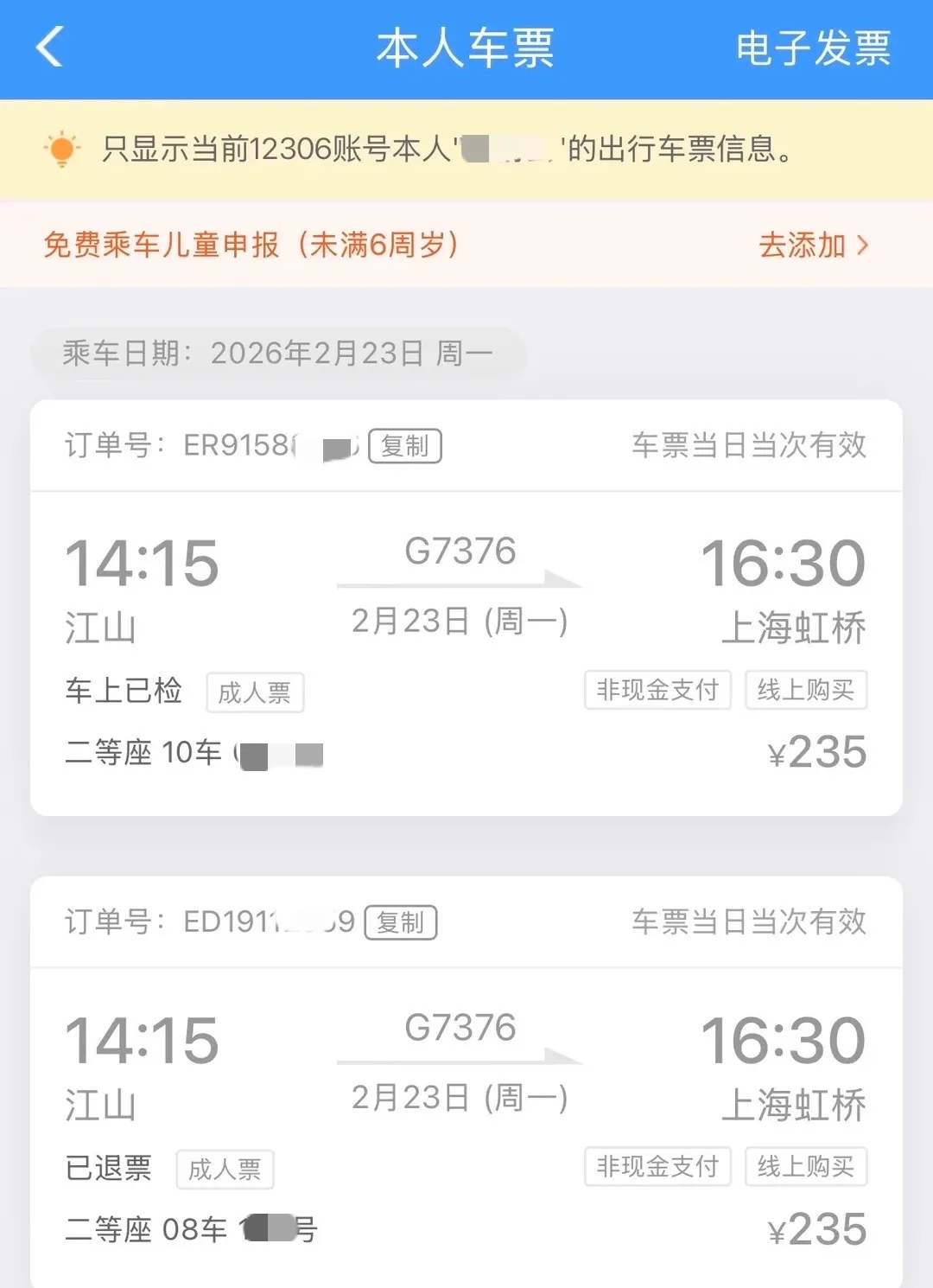 据极目新闻报道,24日下午,记者联系到上述网友。从其提供的订单截图来看,这两张车票均为2月23日14时15分开出的G7376次列车,且均是线上购买。其中一张车票的状态显示为“已退票”。该网友告诉记者,自己是在开车前一分钟退掉了其中一张票,但被扣除了20%的手续费,“如果是在开车后才发现的,那这张票可能就退不掉了。”