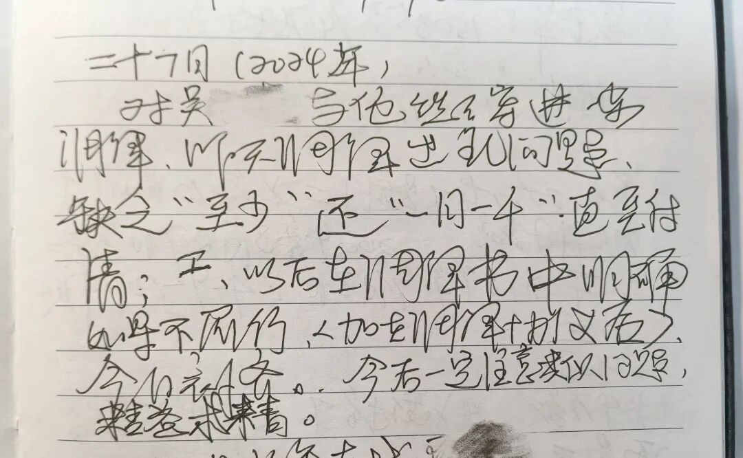 此后,笔记里开始出现越来越多的“改正”痕迹:“今天先去甘井村找了支书,了解了两家矛盾的来龙去脉”——这是对“脱离党组织”的改正。“上午9点走访派出所魏警官,11点到卫生所找吴医生,和他们交流工作”——这是对“沉不下去”的突破。“提醒自己:现在是调解员,不是法官,少说法言法语,多说乡音乡情”——这是对“角色没扮好”的警醒。