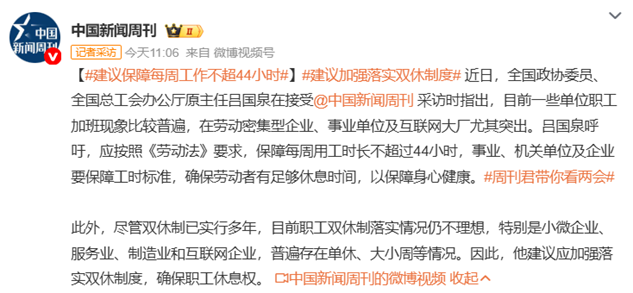 人民法治网讯 近日,全国政协委员、全国总工会办公厅原主任吕国泉在接受@中国新闻周刊 采访时表示,当前一些单位职工加班现象较为普遍,其中劳动密集型企业、事业单位及互联网大厂尤为突出。他呼吁,各类单位应按照《劳动法》要求,保障职工每周用工时长不超过44小时,同时加强落实双休制度,切实保障劳动者休息权。
