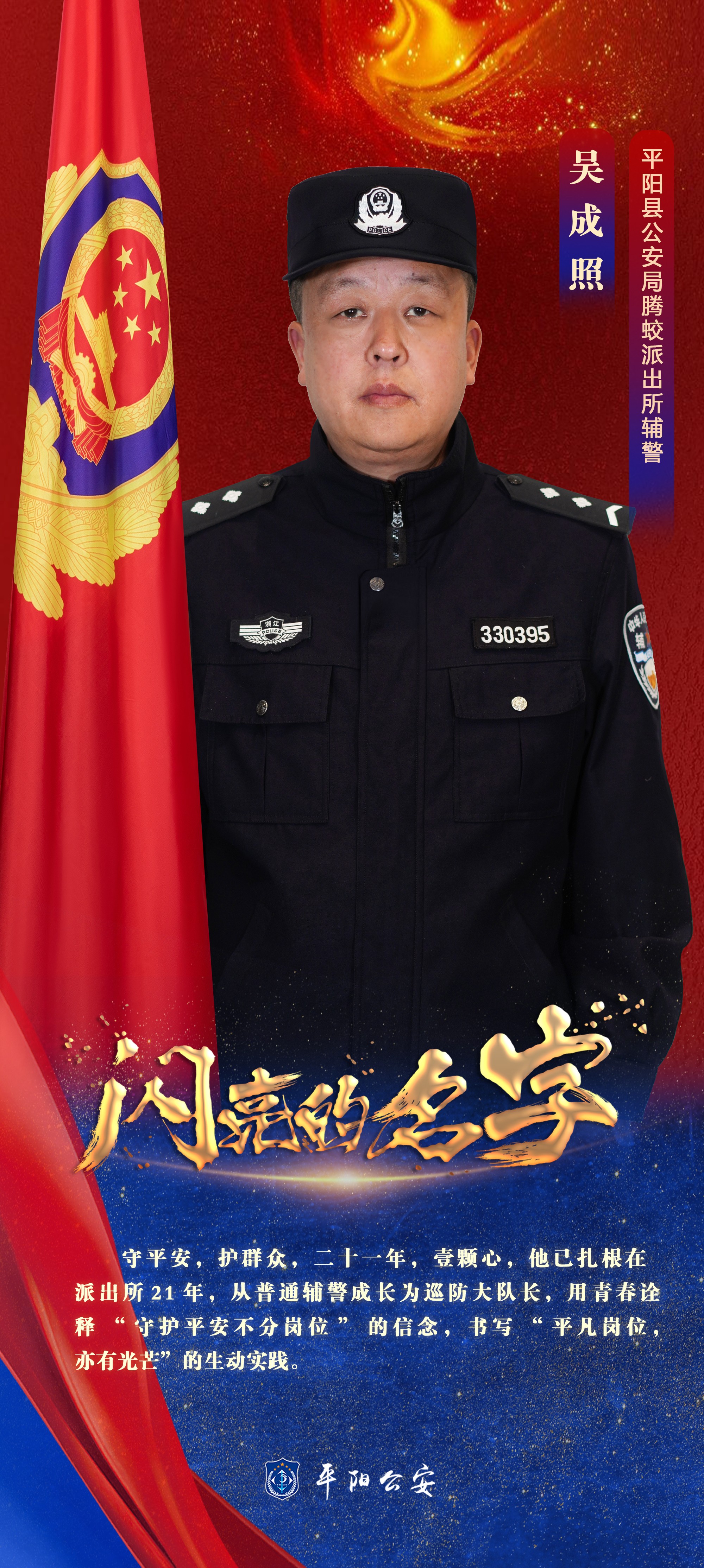 吴成照,是浙江省温州市平阳县公安局腾蛟派出所的一名辅警。今年,已有21年工龄。这份“长情”,从2005年到2026年,从普通辅警到巡防大队长,他把青春,都留给了基层一线。