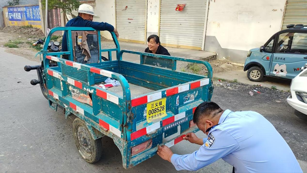交管大队队员为民众电动三轮车贴反光条