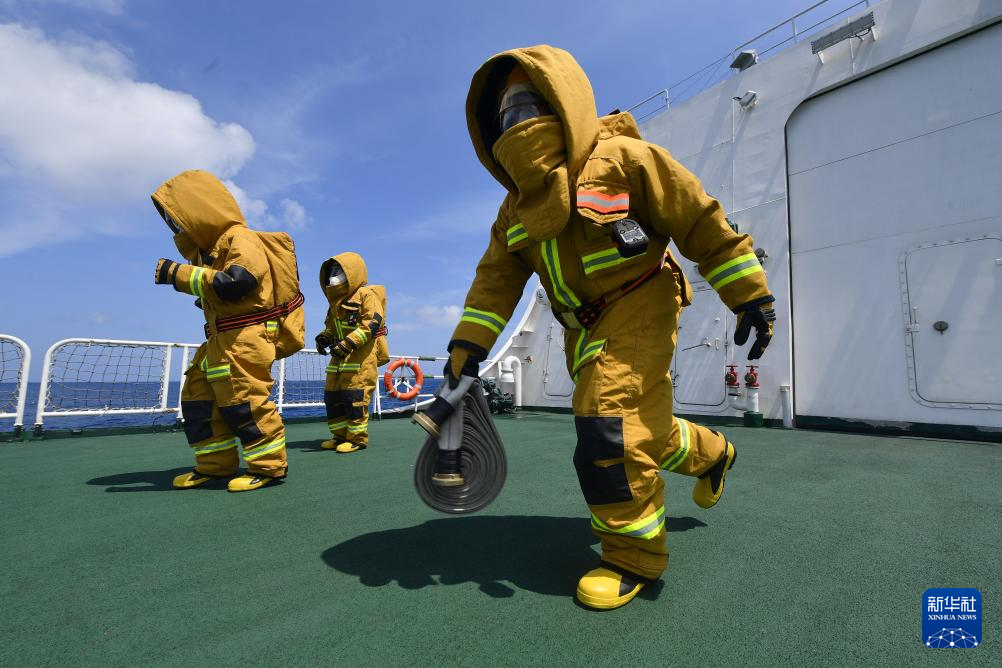 3月8日,海警三都舰组织执法员进行灭火训练。