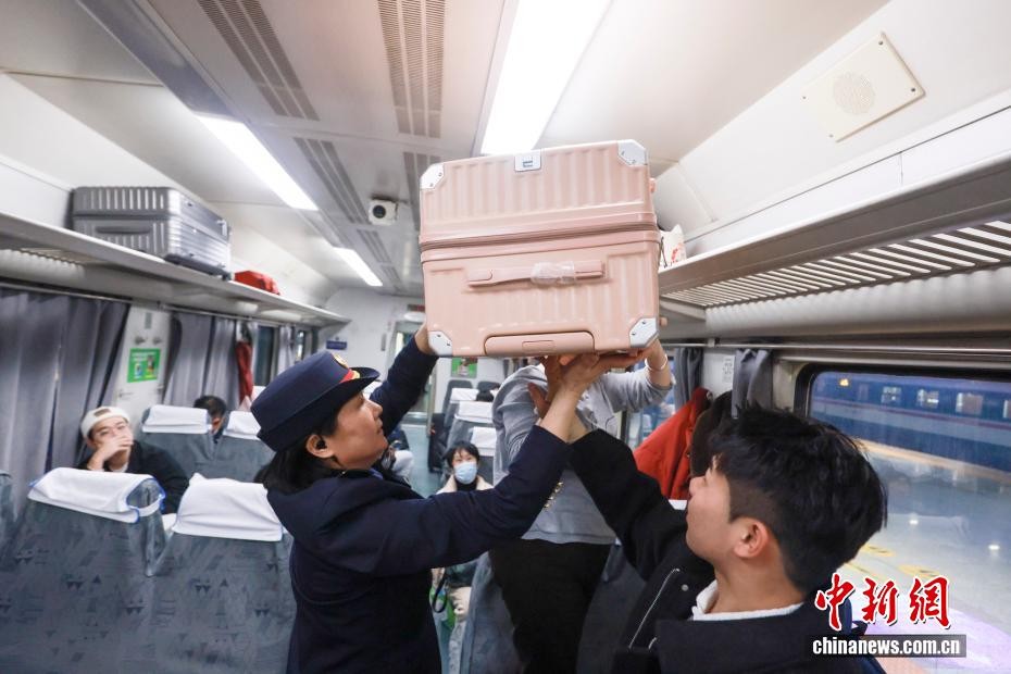 3月11日,最后一次值乘春运任务的K412次列车长宋书香协助旅客搬运行李。当日是2026年春运第38天,今年春运以来全社会跨区域人员流动量预计超90亿人次。中新社记者 贾天勇 摄