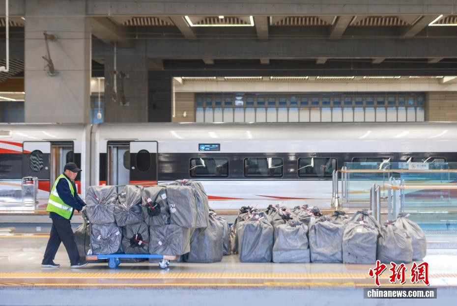 3月11日,中铁快运的工作人员在北京朝阳站运送快件。当日是2026年春运第38天。中新社记者 贾天勇 摄