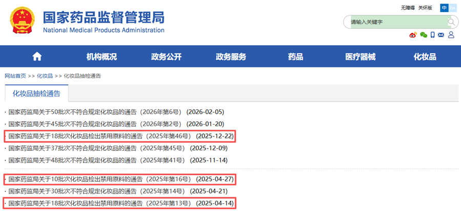 截图来自国家药品监督管理局网站化妆品检出禁用原料通告