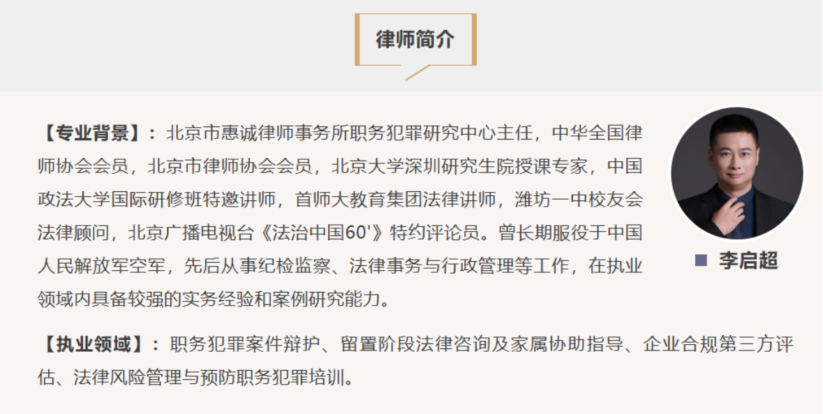 深耕职务犯罪辩护领域多年,2025年李启超凭借扎实的专业能力和突出的行业影响力,组织成立了(惠诚)全国职务犯罪研究中心,并担任主任。在长期的办案实践中,他结合职务犯罪案件的特殊性和行业痛点,首创“留置阶段陪跑”、独创“无人区辩护”两大核心理念,彻底打破了“律师只能在案件移送后介入”的行业固有认知。