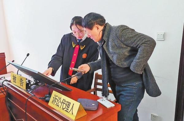 图为江苏省南通市通州区人民法院民一庭法官倪华(左)与被告现场确认工程款转账金额。李慧 摄