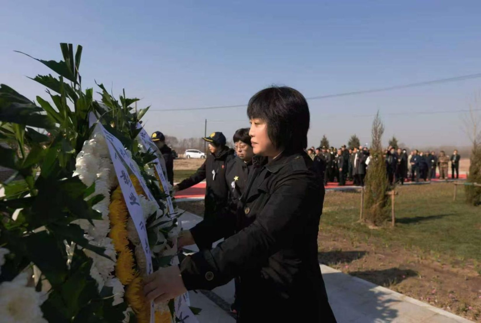 (孙长瑞烈士孙女立香同开国中将詹才芳之女詹鹰为烈士陵园整理花篮缎带)