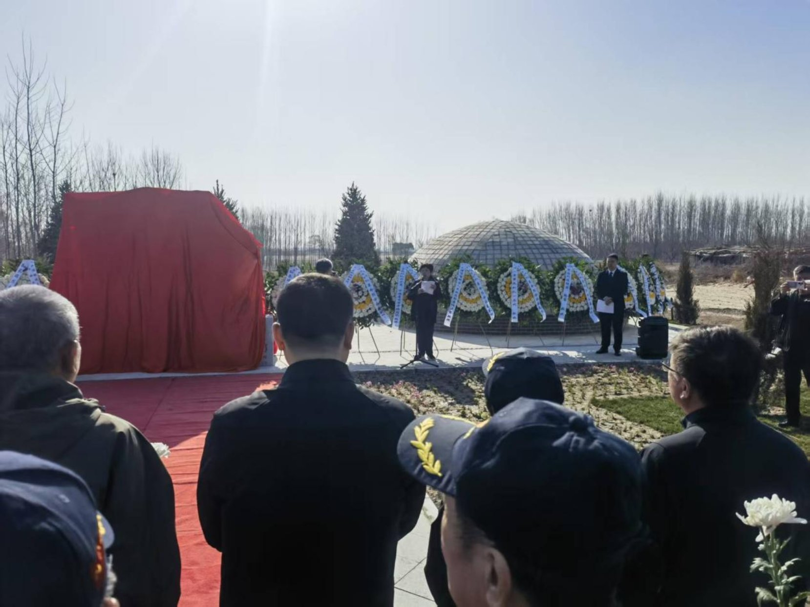 上午9时,落成揭幕仪式正式开始。全场肃立,向革命烈士默哀致敬。仪式上开国中将詹才芳(原东野第九纵队首任司令员)之女詹鹰发表讲话,追忆父辈浴血奋战的峥嵘岁月 。台安县委常委、县政府分管日常工作的副县长潘军勇致答谢词,感谢革命先烈为解放台安,保家卫国,奉献生命,守护平安。感谢各方为陵园建设付出的努力。46军后代代表许光新向台安县委、县政府及台安人民致以诚挚谢意。