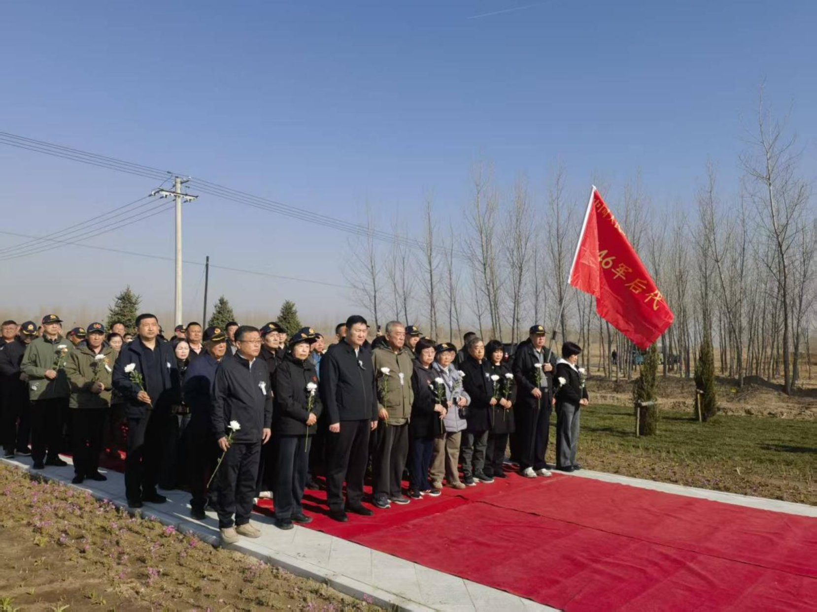 随后,台安县领导与46军后代代表共同为烈士纪念碑揭幕。全体人员依次向烈士献花,表达深切缅怀与崇高敬意。
