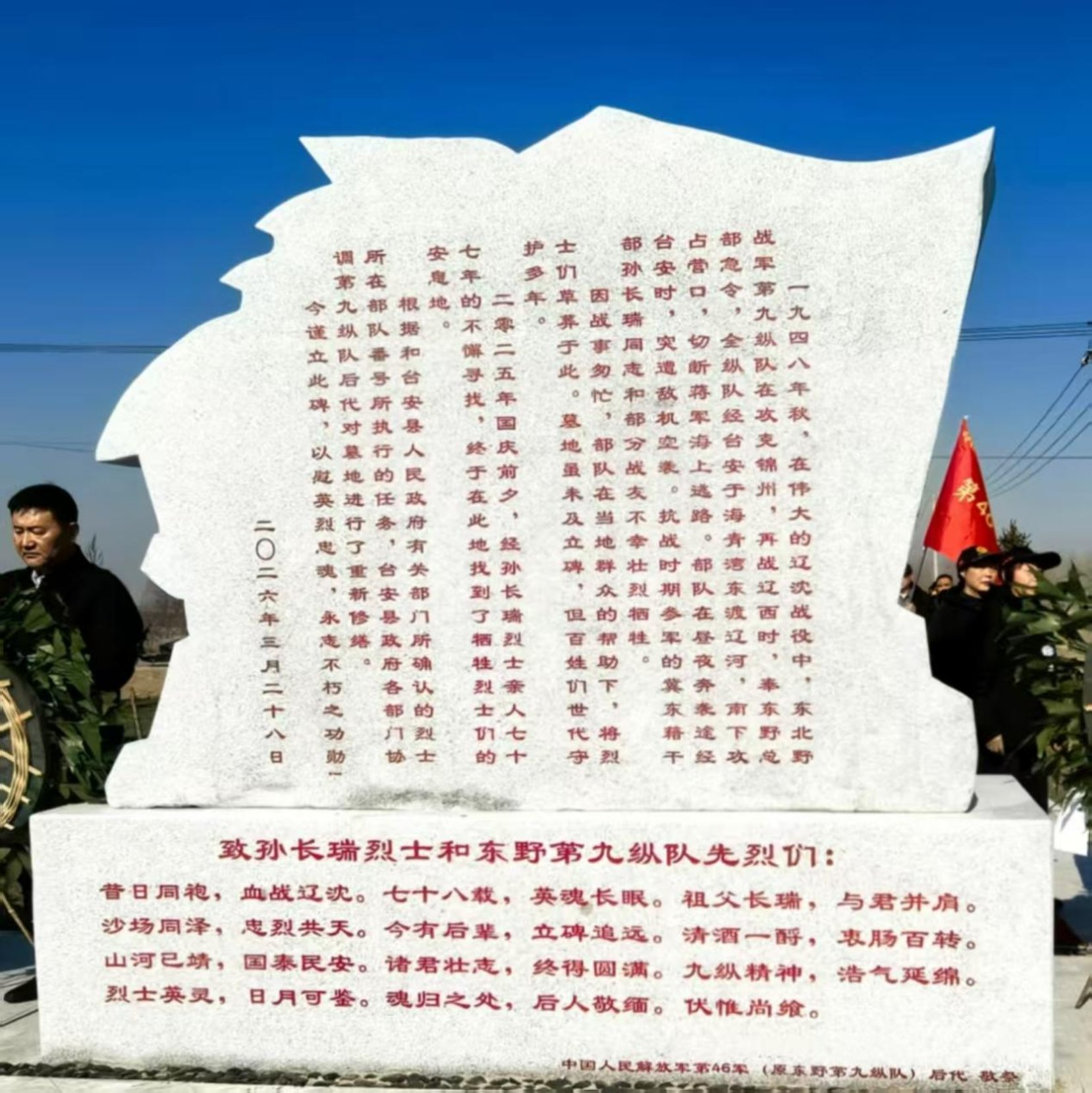 3月28日清晨,中国人民解放军46军(原东北野战军第九纵队)孙长瑞等烈士陵园落成典礼在辽宁省鞍山市台安县桑林镇徐树村庄严举行。原46军领导、中国人民解放军总政治部原副主任袁守芳上将为烈士陵园纪念碑题词:“东北野战军第九纵队革命烈士永垂不朽”。中共台安县委,台安县人民主要领导同志、第46军后代部分代表、烈士孙长瑞的孙女及天津家乡亲友代表、烈士孙长瑞同志的后代在北京国家机关和部队的现职及离退休的亲朋好友、原黑龙江省副省长,人民日报社副社长张建星、人民日报社驻辽宁省分社代表、地方干部群众和各界代表齐聚落成典礼揭幕仪式,共同缅怀革命先烈。