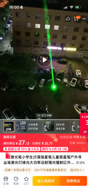 其中一家电商平台的宣传页面显示,一名人员手持一款绿色光柱激光笔,从楼上射向地面,此时有骑电瓶车的路人经过,随后该人员又将激光射向天空,丝毫未考虑对他人的安全隐患。