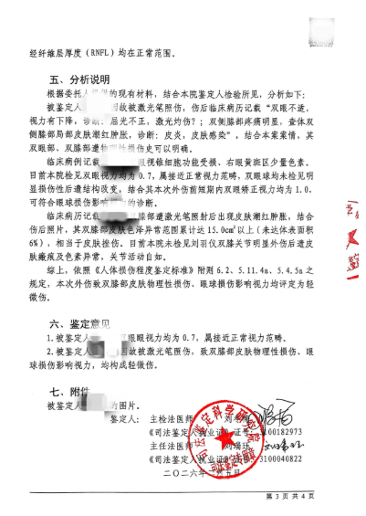 2026年1月,经司法鉴定科学研究院鉴定,刘先生的女儿双眼视力均为0.7,属接近正常视力范畴。但是,因被激光笔照伤,其双膝部皮肤构成物理性损伤、眼球损伤影响视力,两处伤情均构成轻微伤。