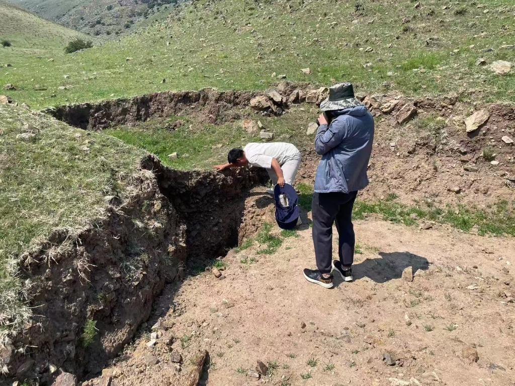 图为办案民警在确认被盗掘古墓葬遗址现场。(受访者供图)