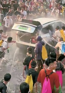 网友发布的现场视频显示,4月14日泼水节期间,一辆白色电动汽车经过西双版纳州景洪市泼水节现场时,有路人上前强行打开车辆后备箱及车门,随后多人围拢上前,使用高压水枪向车内猛喷,场面混乱,车辆被迫加速驶离。
