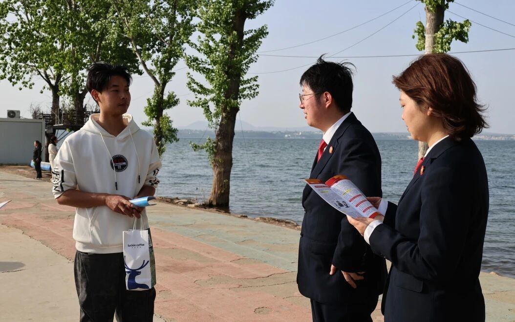 春风拂绿陆浑岸,法治护航文旅兴,随着洛阳牡丹花会开始,嵩县陆浑湖也成为周边热门旅游地,近日,河南省洛阳市嵩县法院田湖法庭干警走进陆浑湖沿线热门文旅点位,开展沉浸式法治宣传活动,将法律服务送到游客身边、商户门前。