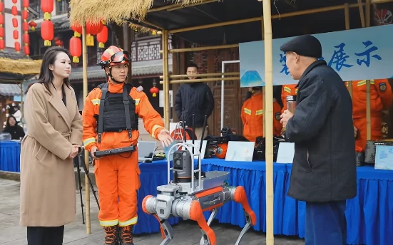 “这只机器狗是一个救灾型设备,是进入毒气、废墟、辐射等极端危险环境的‘先锋兵’。它可以帮助救援队先行侦察、回传影像、定位风险,提升救援效率。”在基础装备与现场体验展区,有限空间作业防护装备、应急救援器材整齐陈列。专业人员现场细致解说装备的适用场景、操作规范,指导村民体验操作。