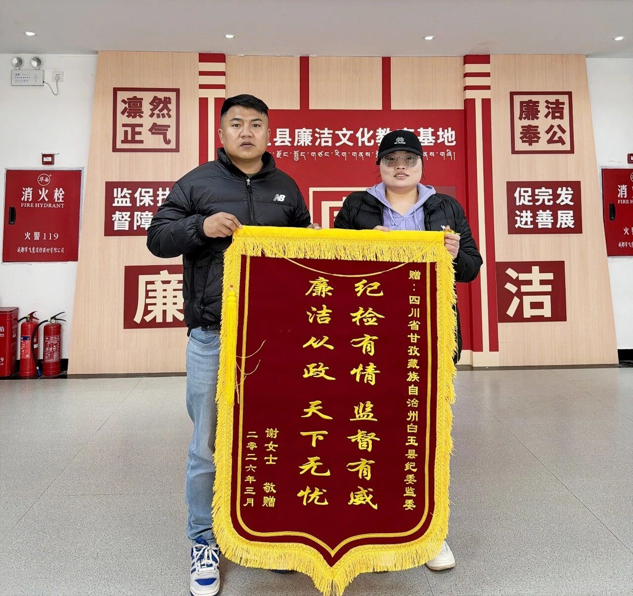 白玉县登龙乡龚巴村谢女士向该县纪委监委赠送锦旗